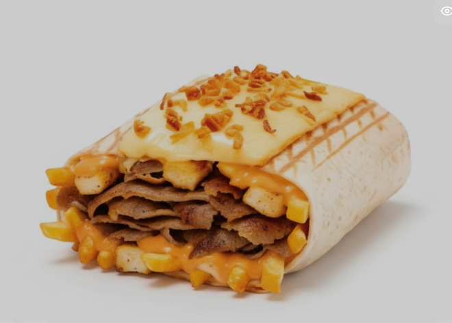 kebab, poulet, sauce algérienne, fromage gratiné raclette