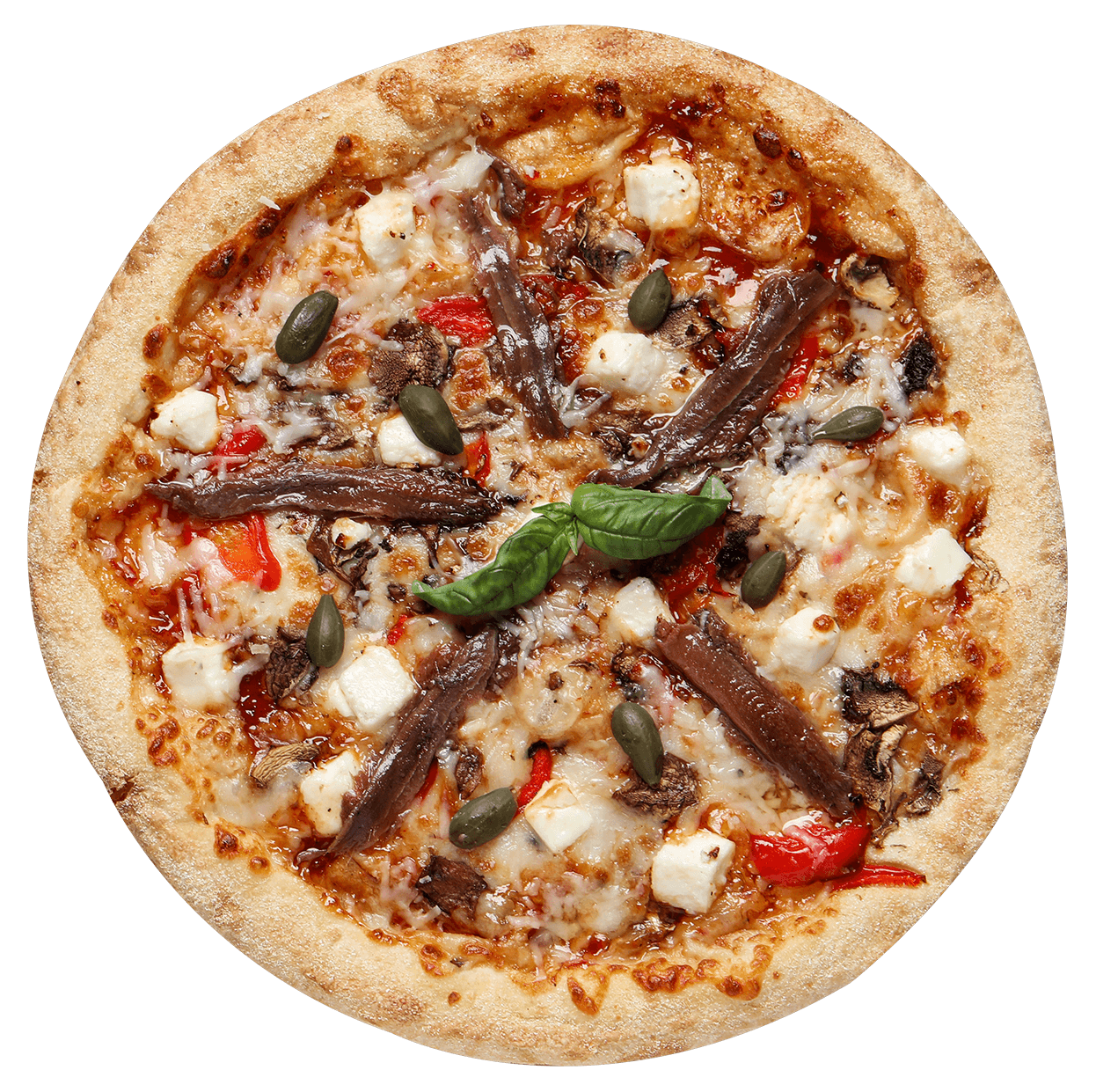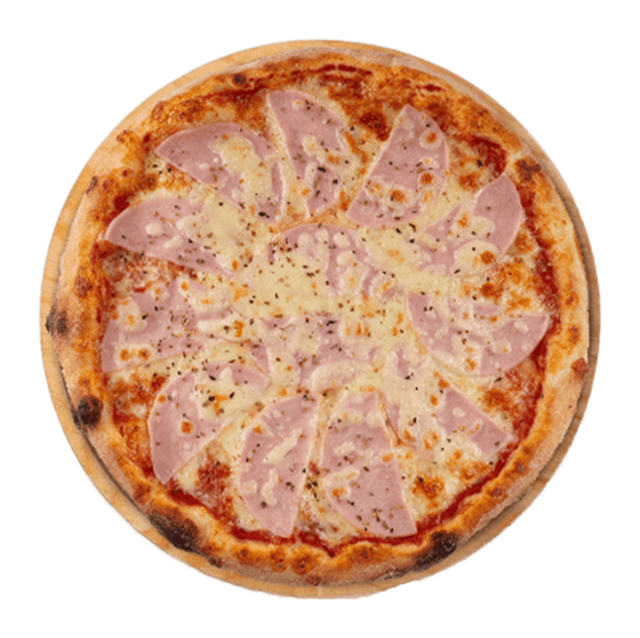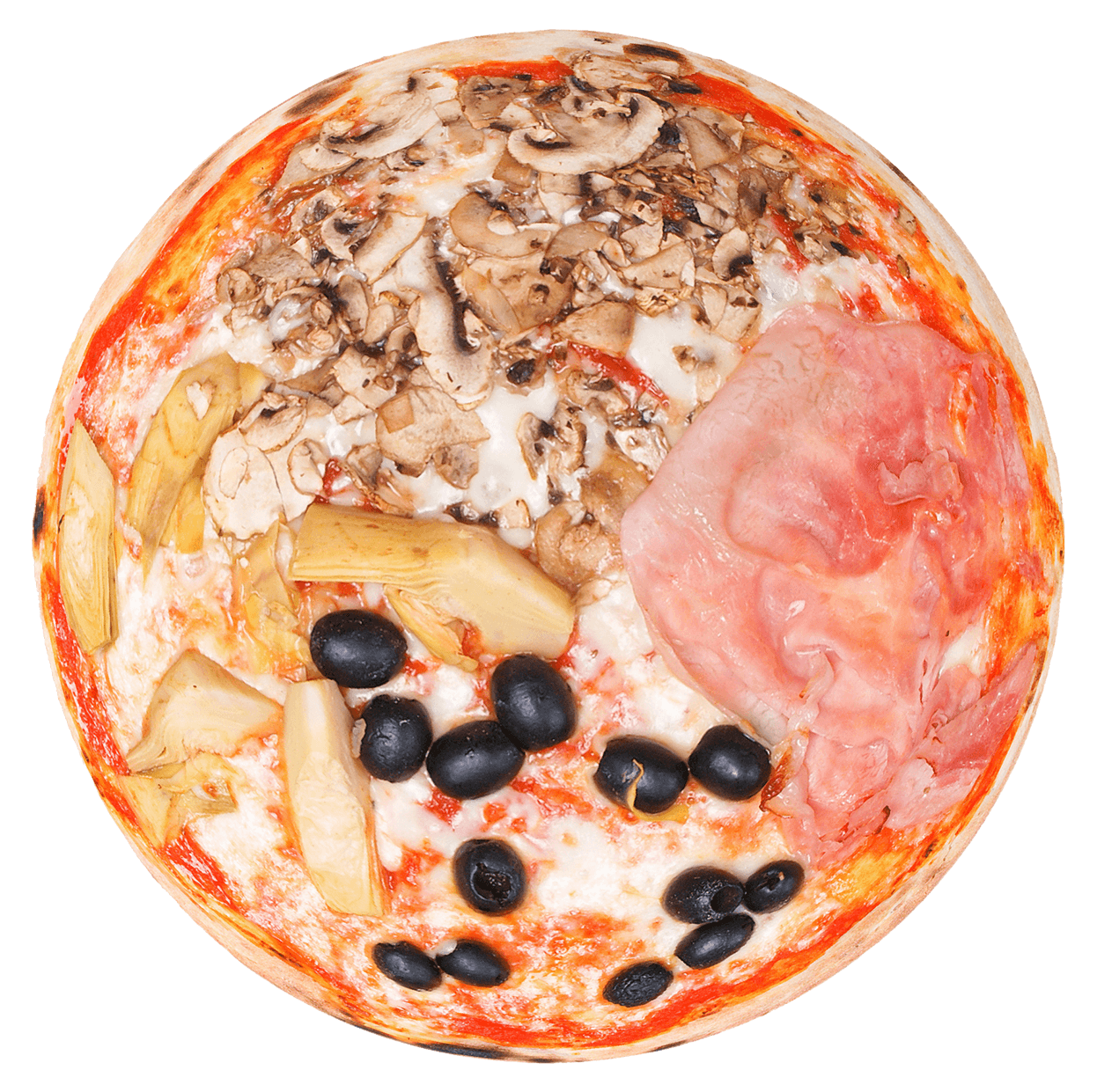 Tomate, mozzarella, champignons, poivrons, jambon, artichauts, olives.