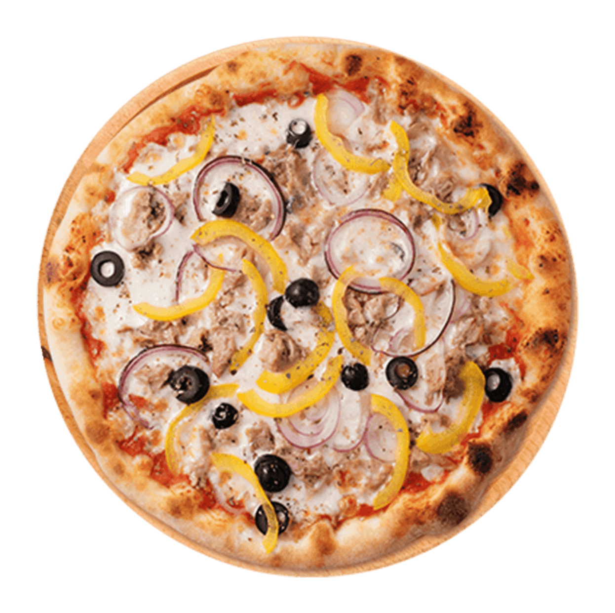 Tomate, mozzarella, thon, olives, oignons, oeuf.