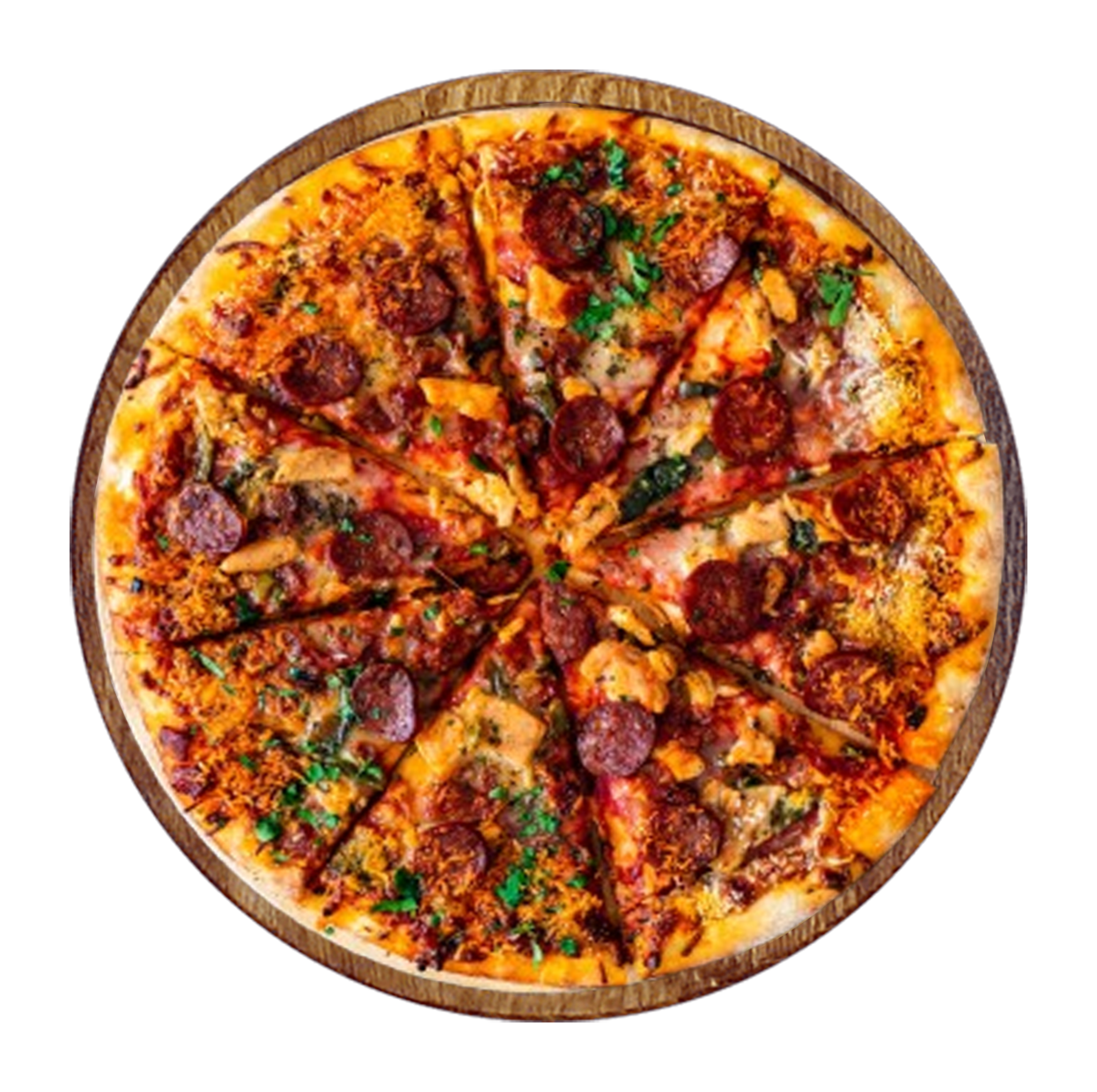 Tomate, mozzarella, viande hachée, merguez, poulet, jambon, oeuf.