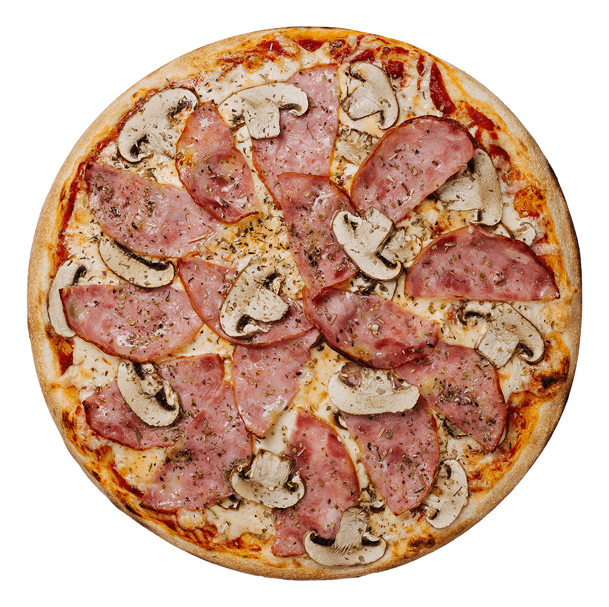 Tomate, mozzarella, jambon, champignons.