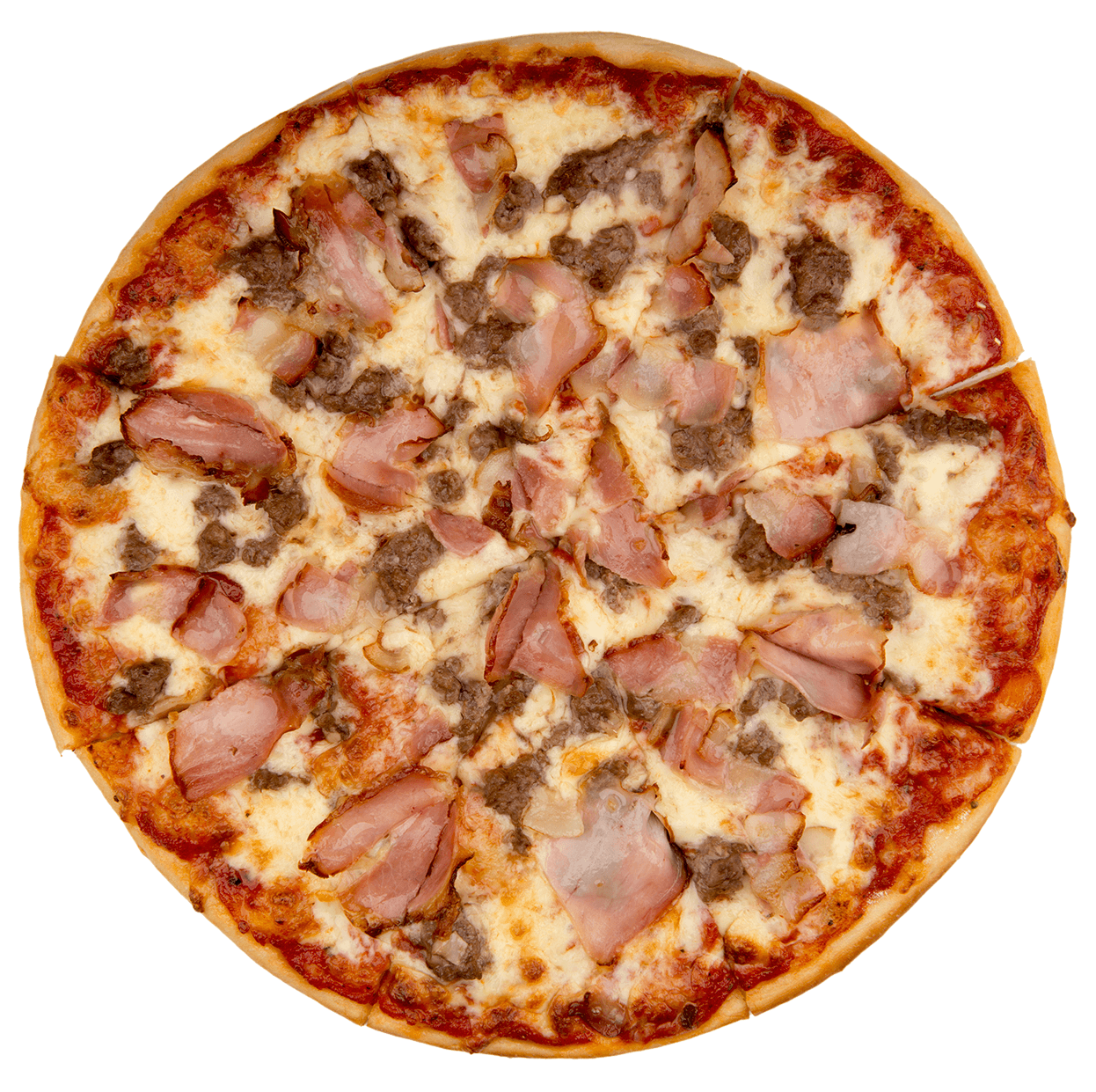Tomate, mozzarella, viande hachée, bacon, chèvre.
