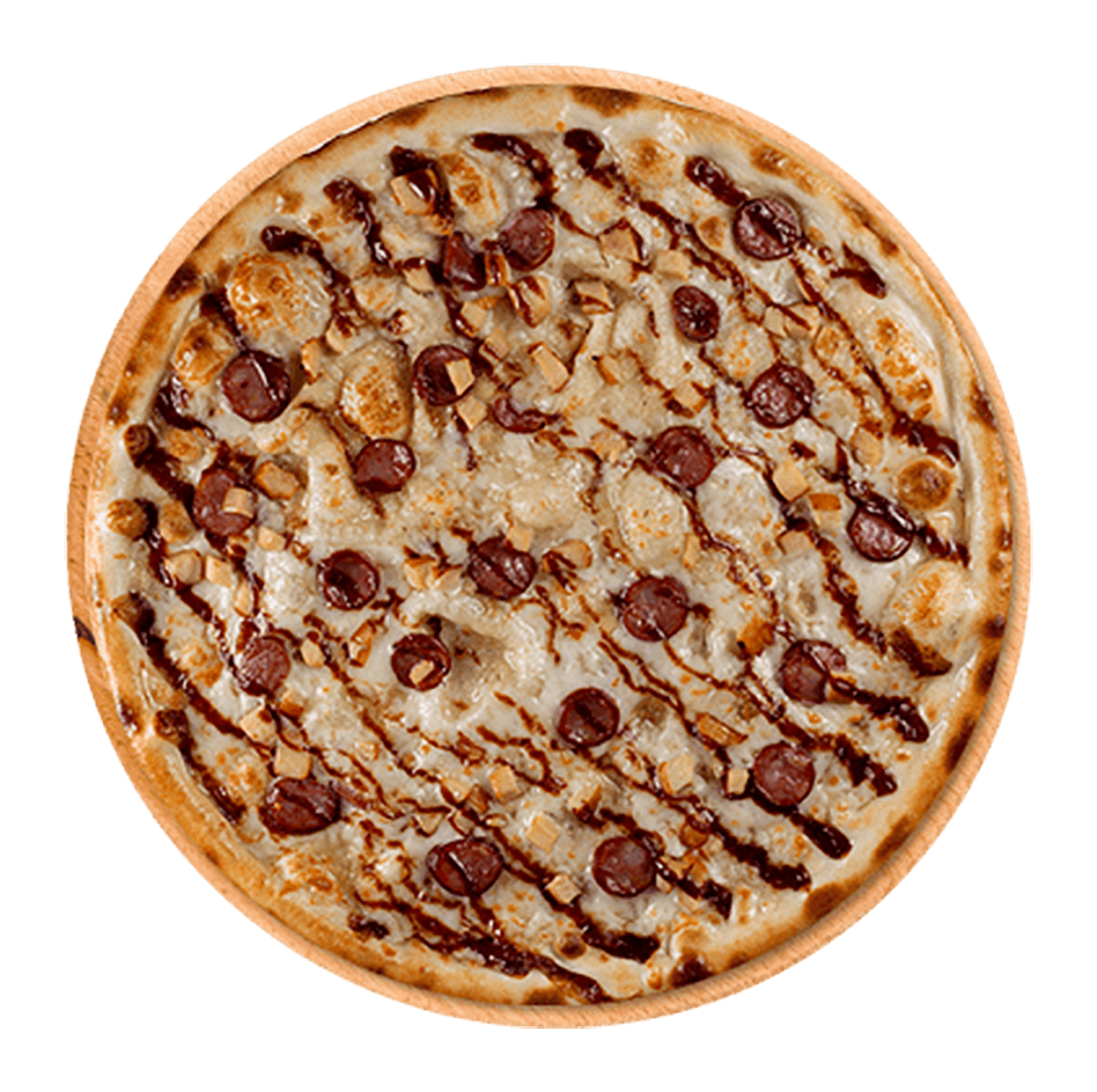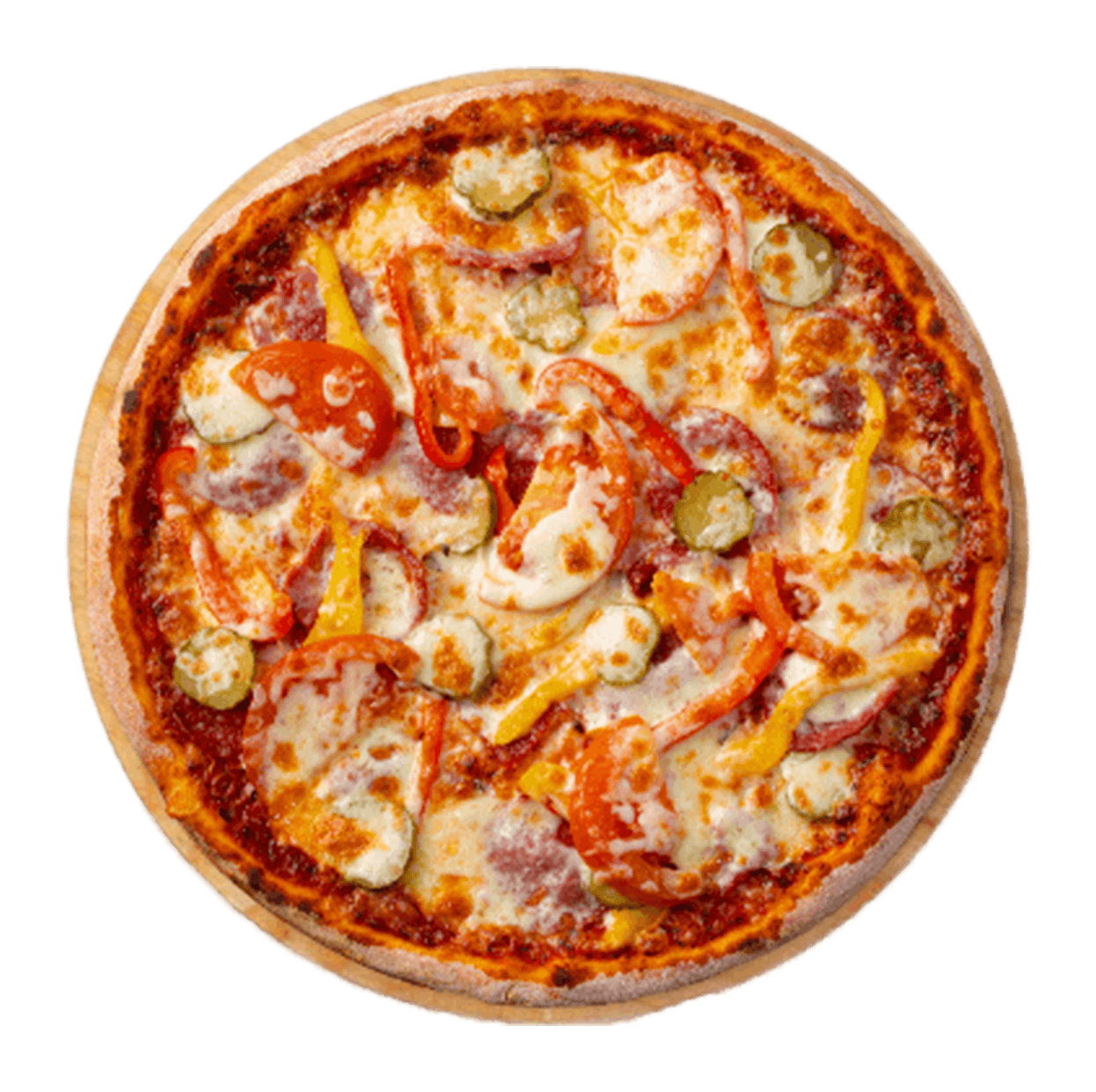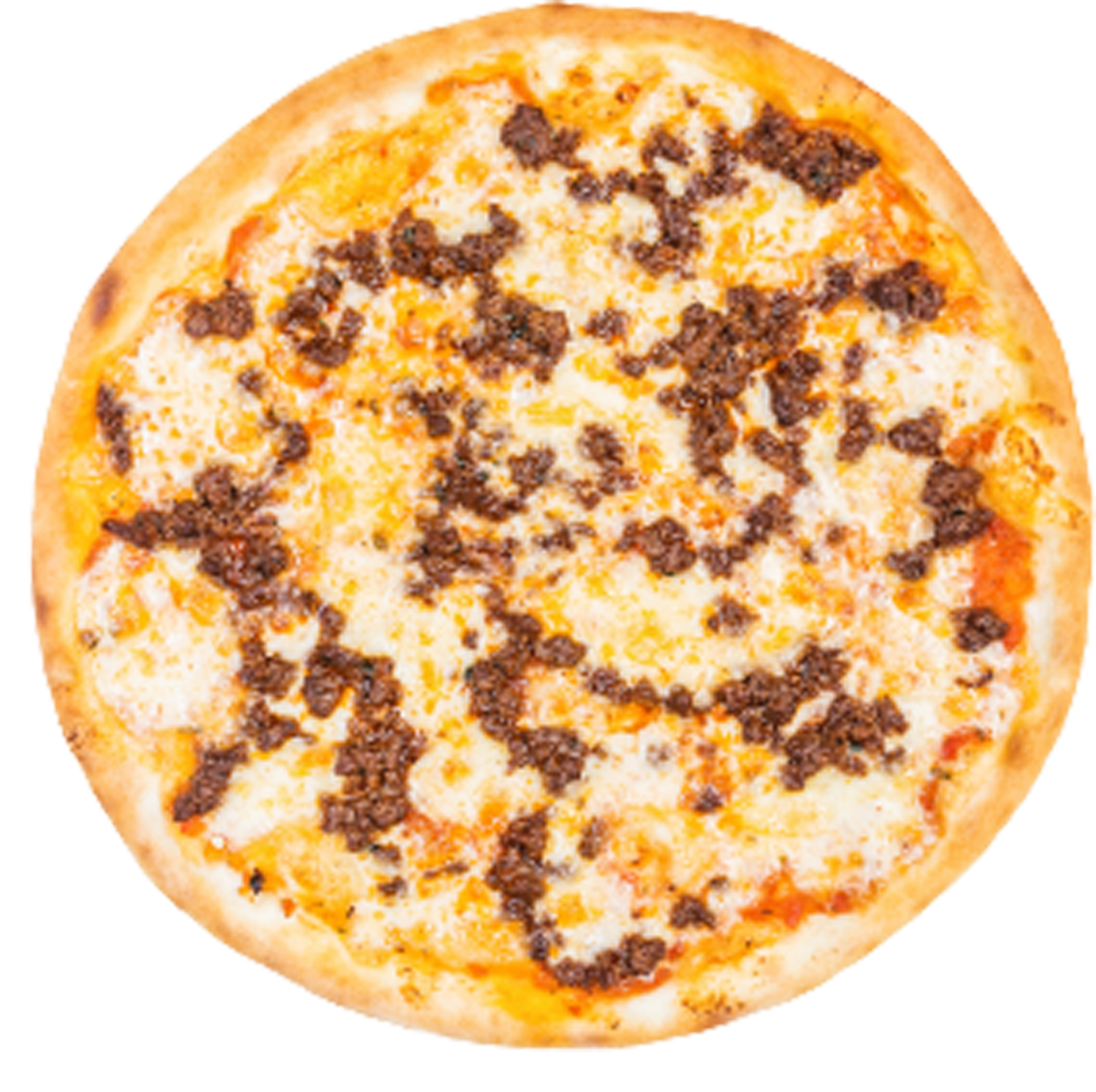 Tomate, mozzarella, viande hachée, merguez, oignons , poivrons.