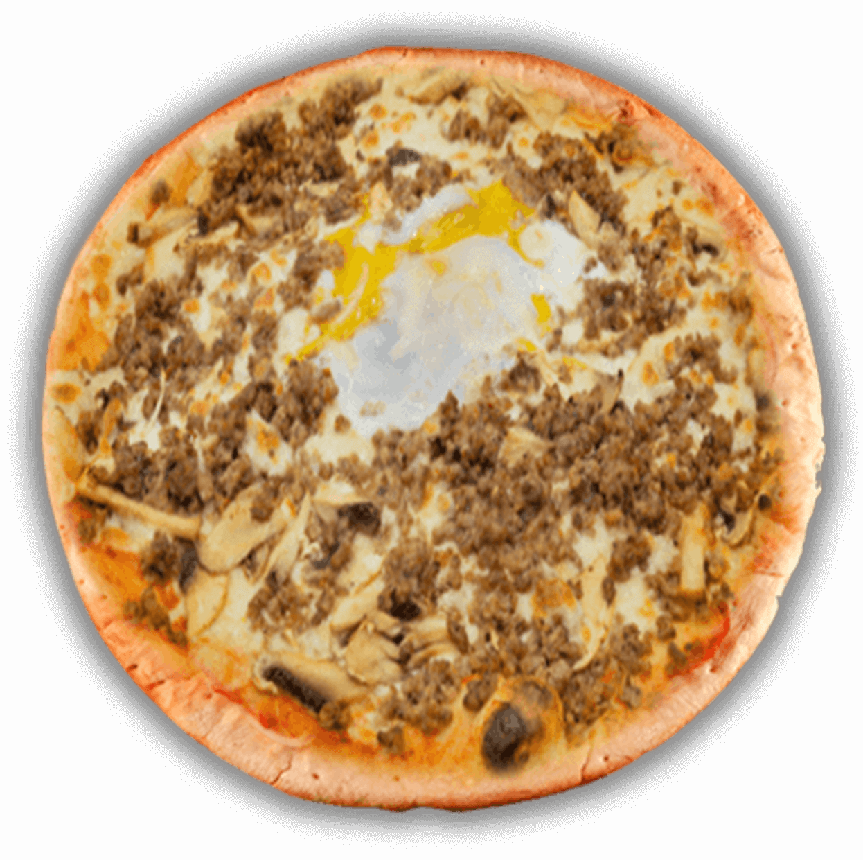 Tomate, mozzarella, viande hachée, champignons, oeuf.