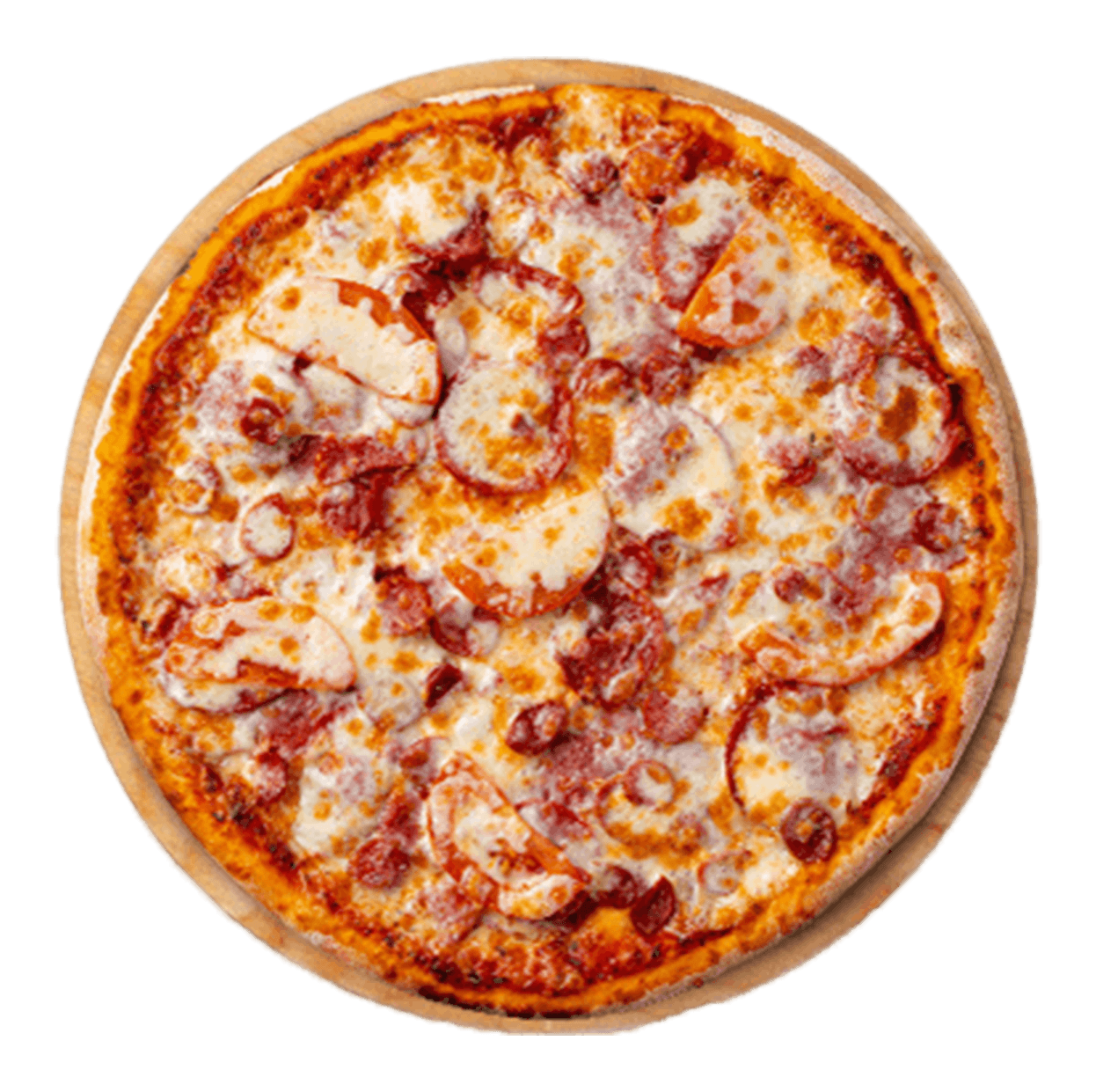 Tomate, mozzarella, jambon, bacon, chèvre.
