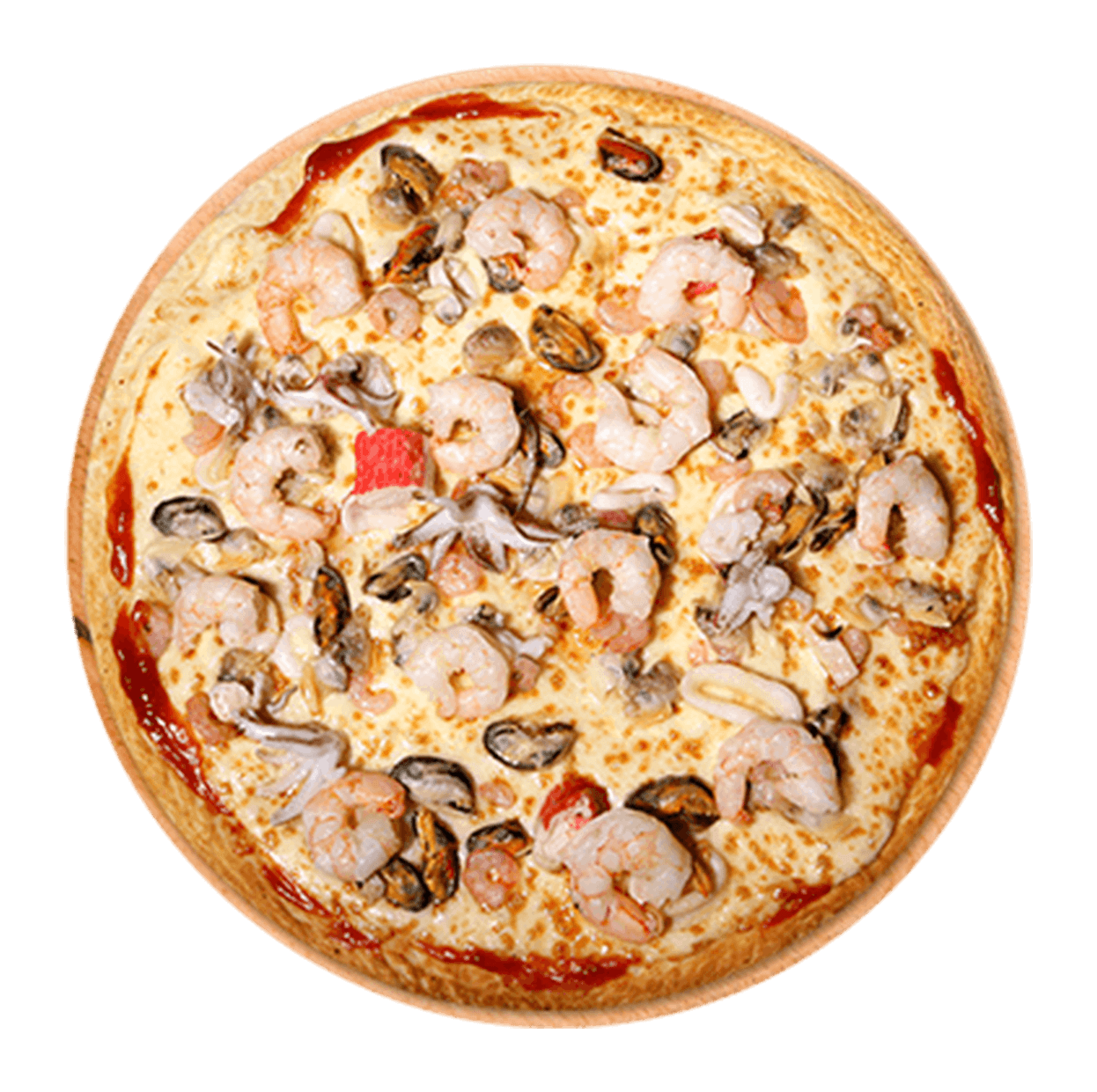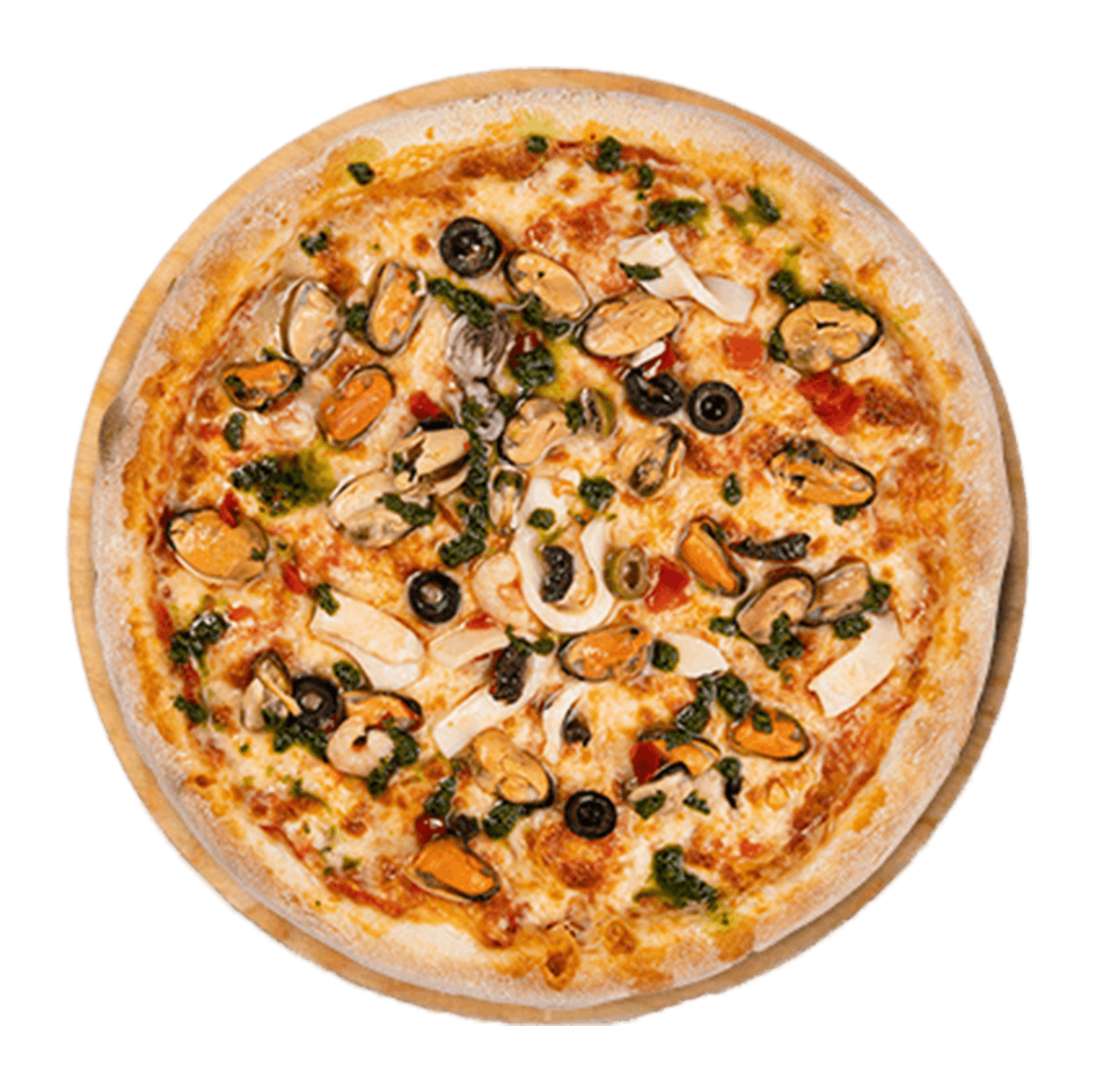 Tomate, mozzarella, cocktail de fruits de mer, ail, persil.