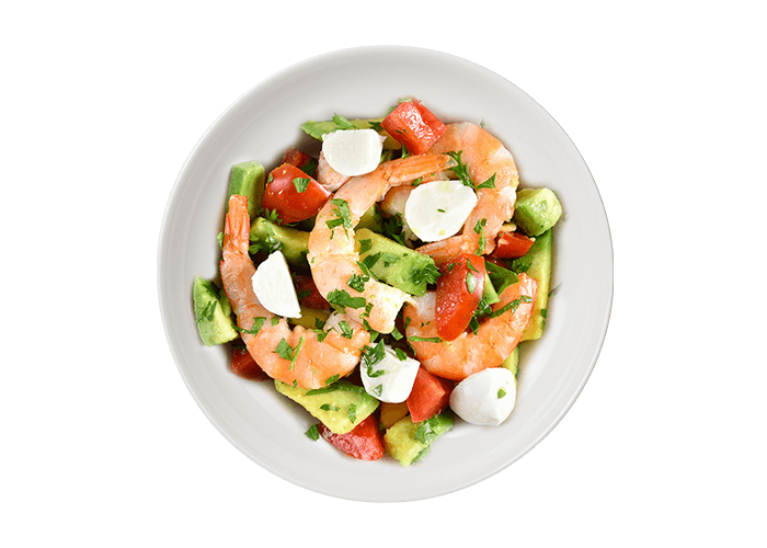 Salade, tomates, avocat, maïs, crevettes, sauce cocktail.