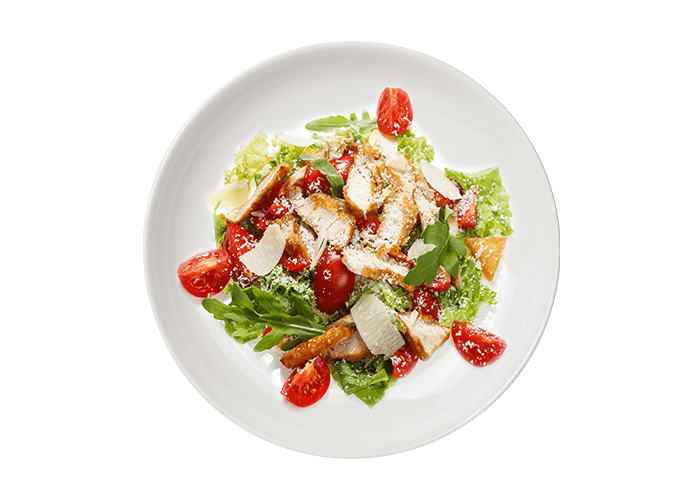 Salade, tomates, maïs, poulet fumé, olives, fêta.